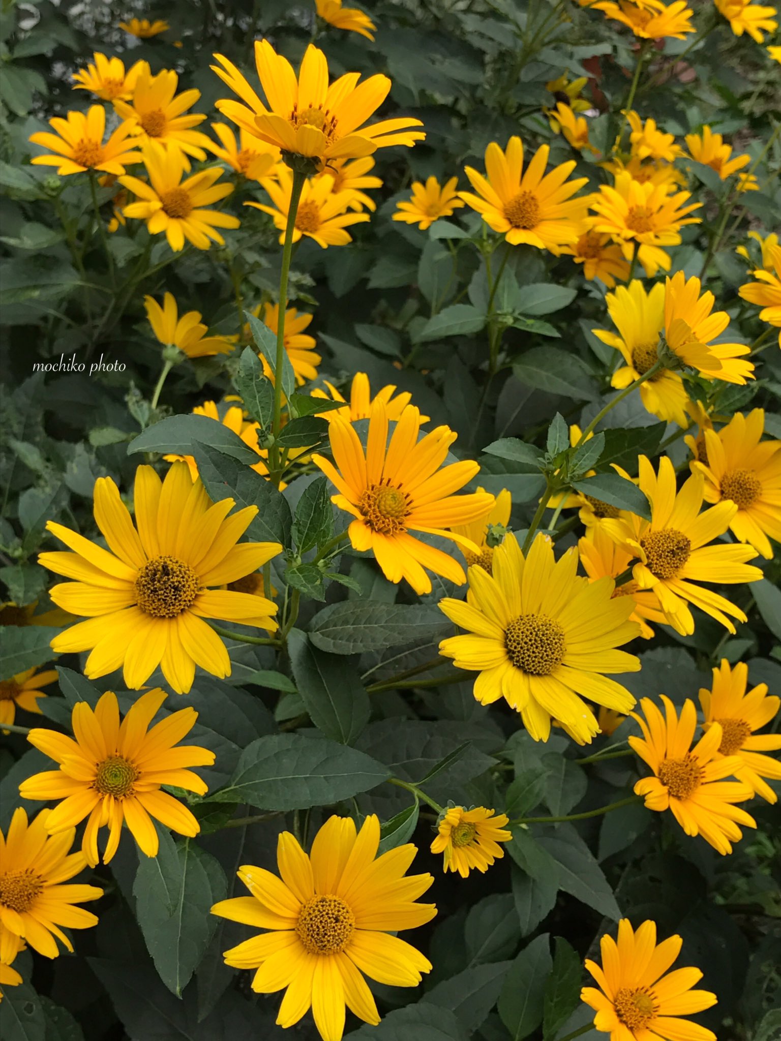 さくら餅子 姫ひまわり 菊芋もどき キク科 北アメリカ原産 株元から沢山分枝し まっすぐ伸びた茎先に ひまわりに似た小花が 初夏 秋まで 次々と咲く宿根草 一重咲と八重咲きがある 花言葉はひまわりと同じ 崇拝 憧れ と 細やかな気配り 今日も